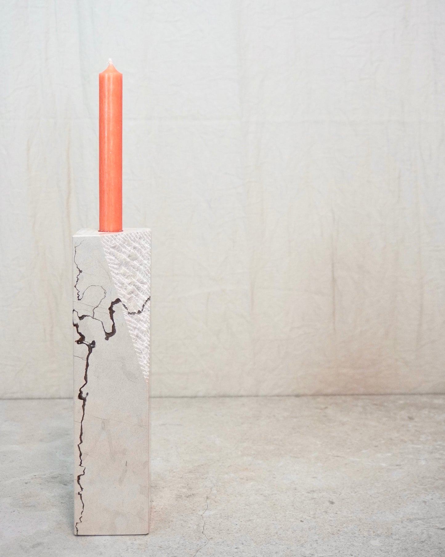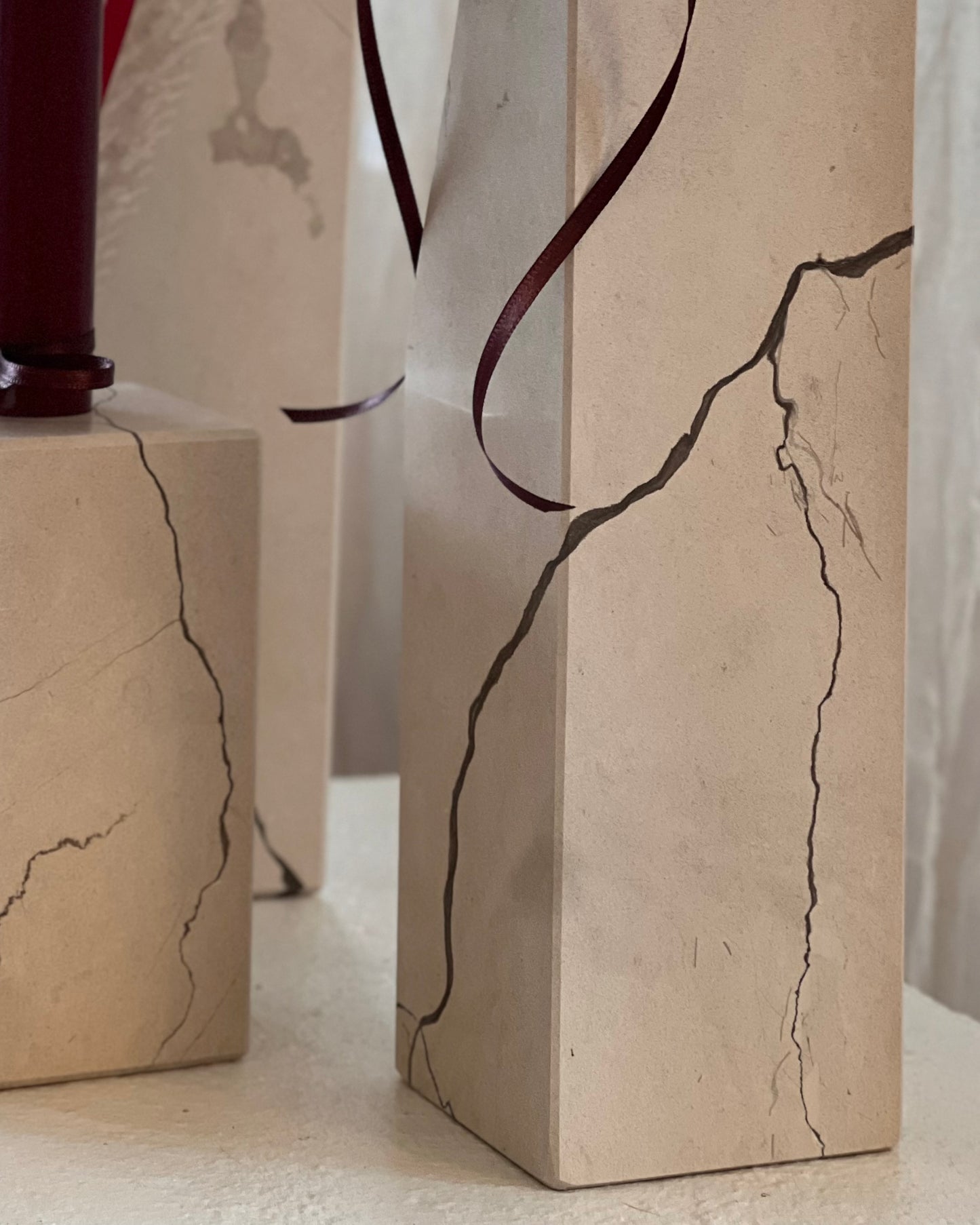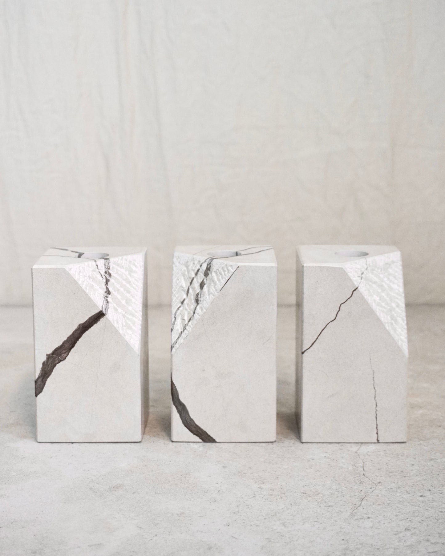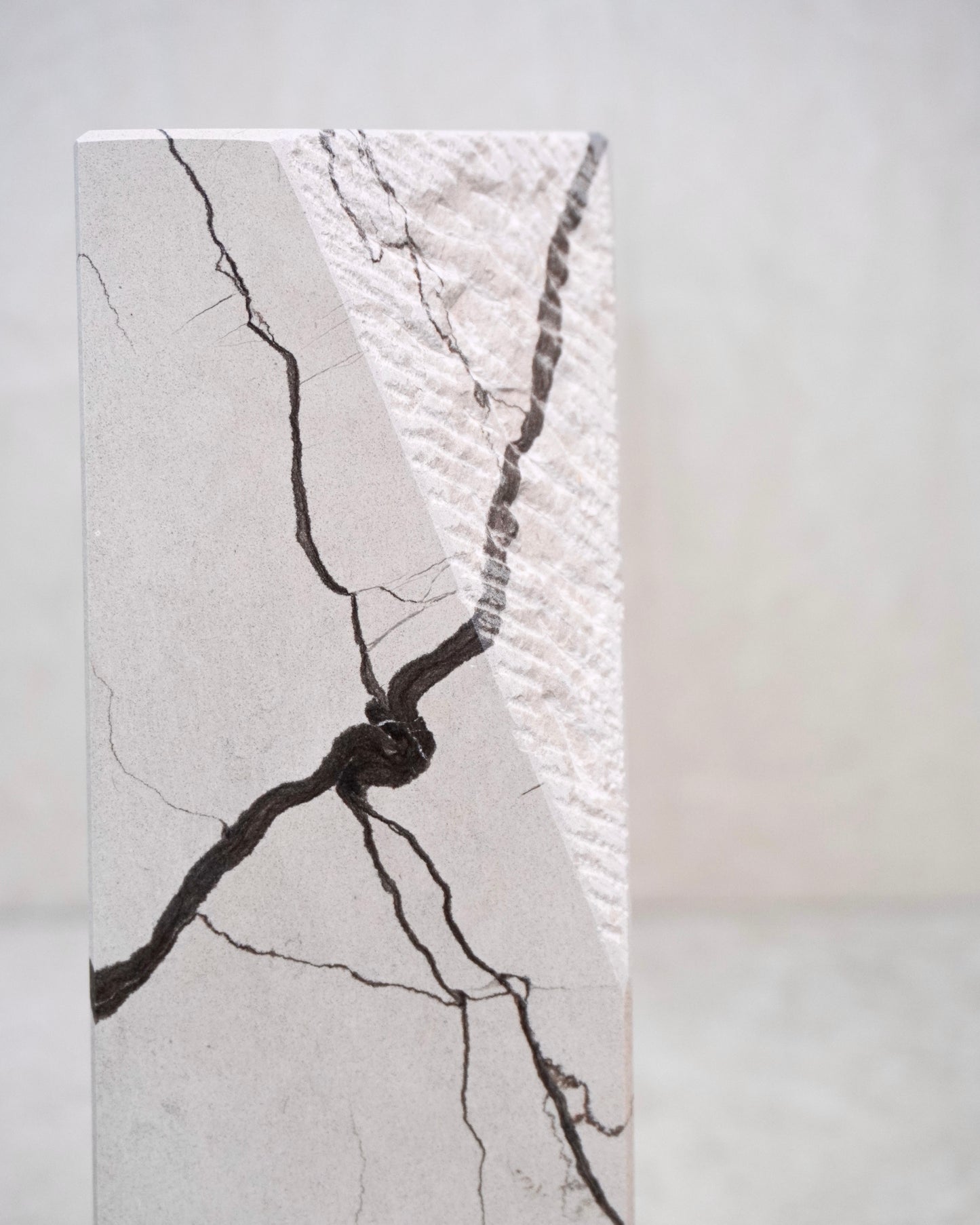 Massiver Stein, gewachsen über Jahrmillionen, mit charakteristisch dunkler Maserung. In präziser Handarbeit in klare Formen gebracht. Jede Kante, jede Linie: das Ergebnis geduldiger Arbeit.